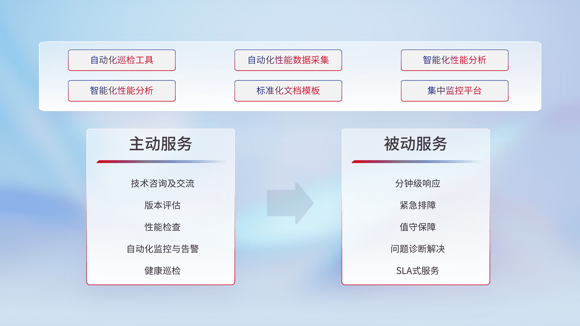 智能化工具和标准化文档,,,保障服务质量,,,,提供主动服务(包含技术咨询、、、、版本评估、、、性能检查、、、自动化监控与告警、、、健康巡检)和被动服务包含(分钟级响应、、、紧急排障、、、值守保障、、、问题诊断解决、、、、SLA服务)。。。